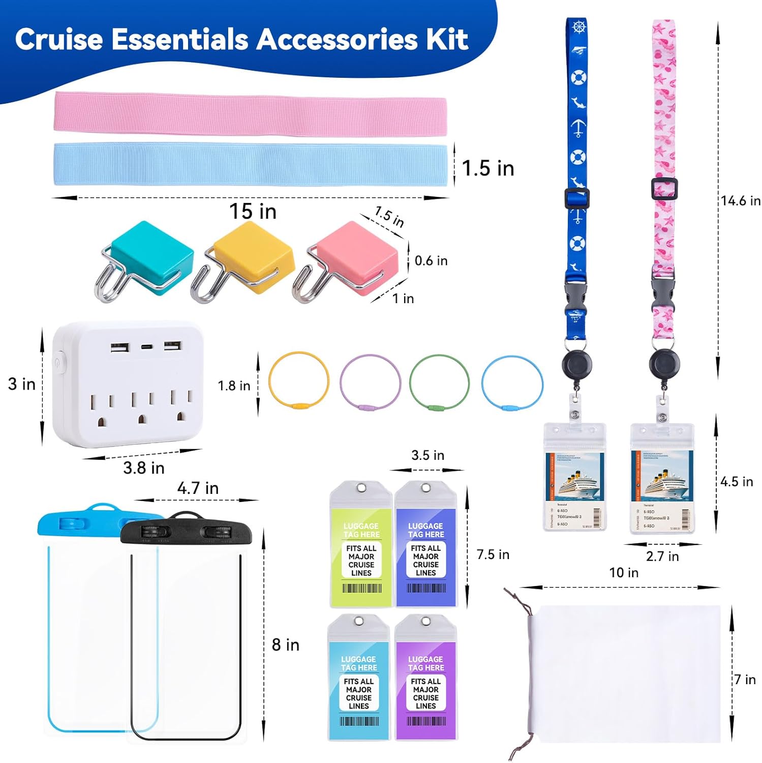 - ✅【All-in-One Cruise Essentials】 Receive the cruise essentials kit, including 15 accessories: 1× non-surge protector, 2 × retractable cruise lanyards, 4 × luggage tags, 2 × waterproof phone pouches, 2 × towel bands, 3 × magnetic hooks, and 1 × storage pouch. This ample quantity is suitable for all major cruise lines and traveler types, making it the ideal choice for your cruise or trip