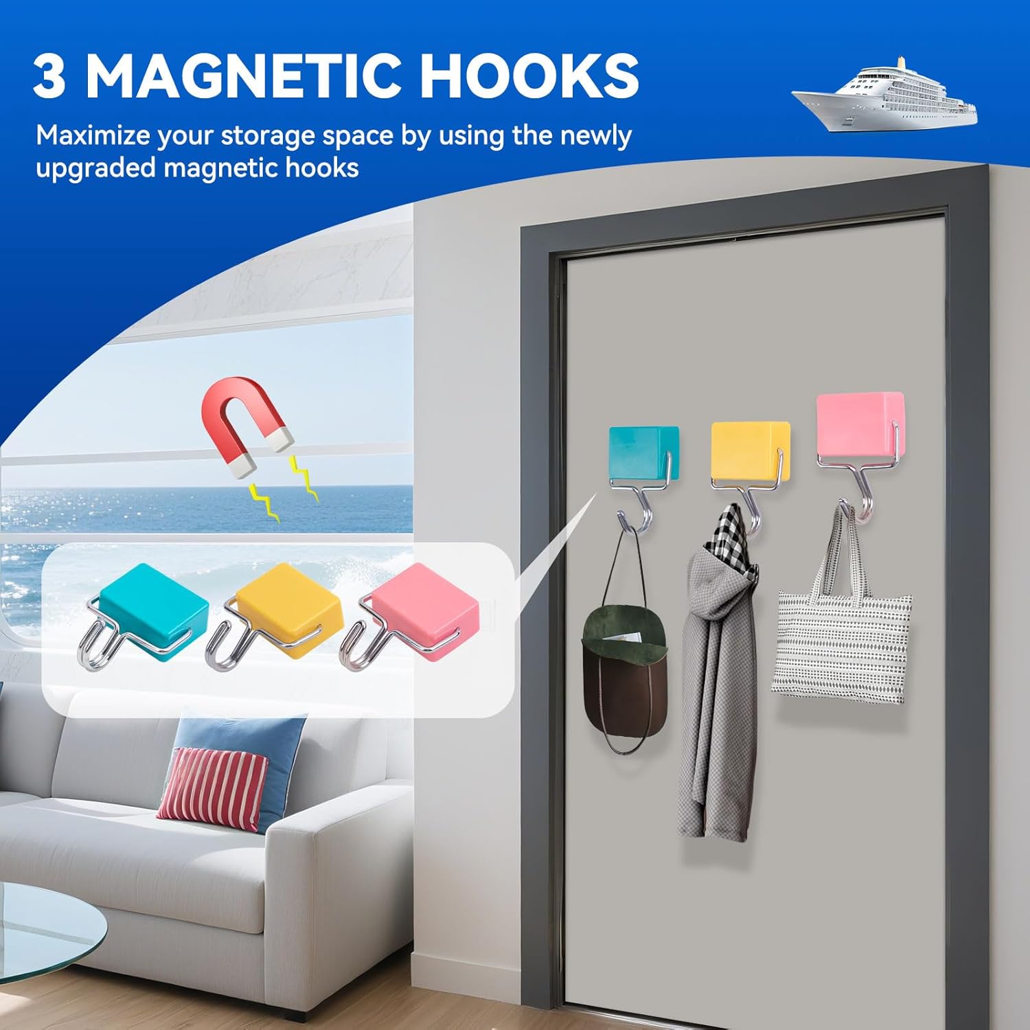 - ✅【Strong Magnetic Hooks for Cruise Cabins】We provide three magnetic hooks. These super-strong hooks feature a reliable magnetic design that sticks to most metal surfaces, so you won't have to worry about them falling off. They're perfect for hanging hats, clothes, bags, and more. Keep your essentials close at hand and make your cruise cabin feel as tidy and convenient as home